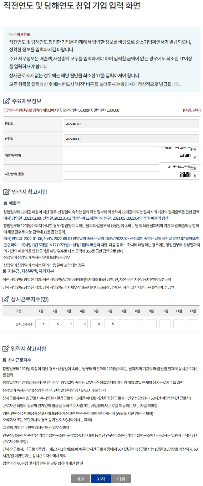 - 매출액 : 창업일로부터 12개월 이상 지난경우 / 12개월이 되지 않은 경우에 따라 계산하여 입력