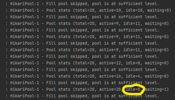 우선 실제로 커넥션풀의 20개 커넥션이 모두 사용되는지 확인하기 위해 hikari 로그 출력 설정을 추가함