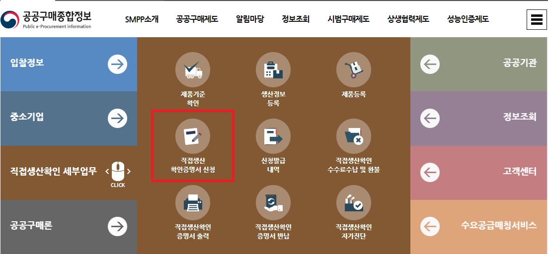 4. 메인화면으로 돌아오셔서 직접생산확인증명서를 신청합니다.