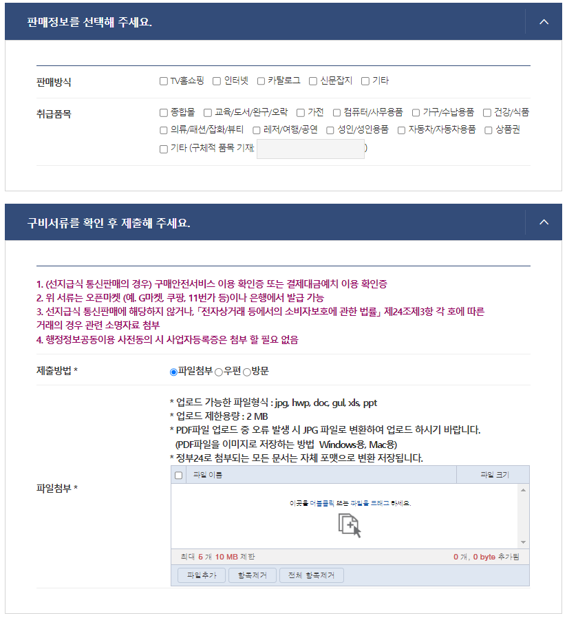 직접 방문을 하실 경우 대표자의 신분증, 사업자등록증, 구매안전서비스 이용확인증을 준비하셔서 시, 군, 구 또는 관할지역기관이나 공정거래위원회에 접수 신청하시면 됩니다.