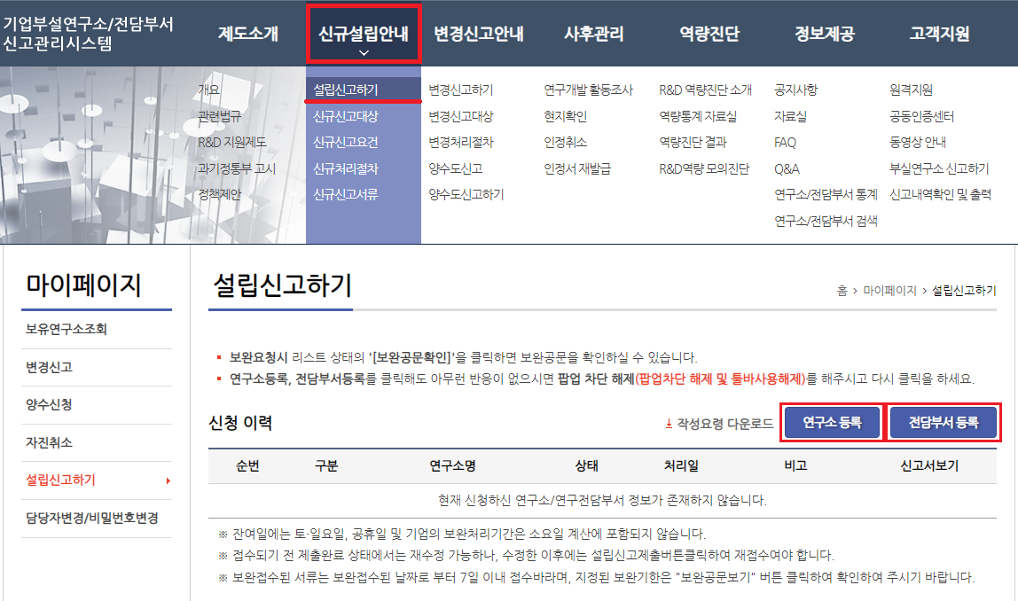 기업부설 연구소 연구개발전담부서 신고관리시스템