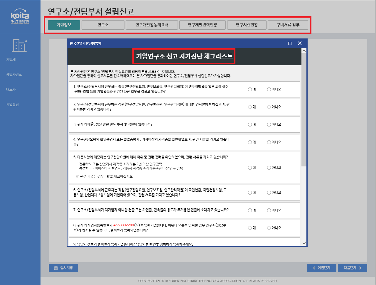 3. 기업연구소 신고 자가진단 체쿠리스트 완료 후 기업정보, 연구소 연구개발활동개요서, 연구개발인력현황, 연구시설현황, 구비서류 첨부 후 제출