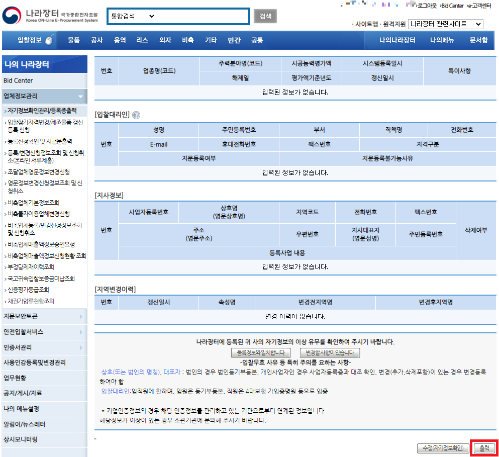 2. 업체정보관리 → 자기정보확인관리/등록증출력
