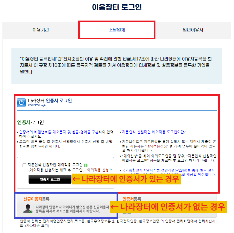 1. 조달청 이음장터 홈페이지에서 '조달업체'로 로그인합니다.