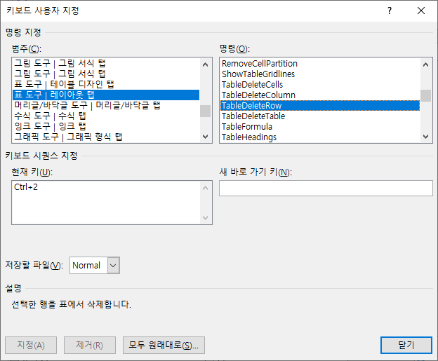 행을 삭제하는 명령인 TableDeleteRow에도 단축키를 지정해 줍니다. (저는 Ctrl+2로 지정하였습니다.)