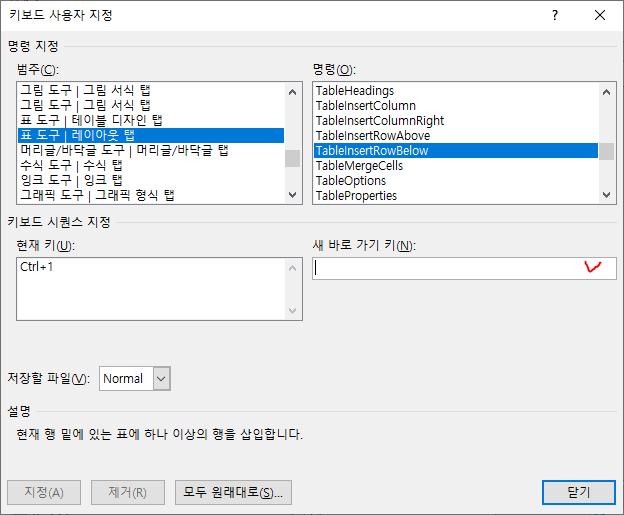 표 도구 | 레이아웃 탭을 클릭하여 TableInsertRowBelow에 단축키를 지정해 줍니다. (저는 Ctrl+1로 지정하였습니다.)