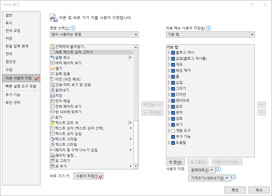 리본 사용자 지정 메뉴에서 사용자 지정 버튼을 클릭합니다.