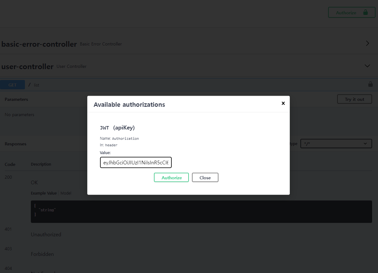 securitySchemes : 스웨거에서 사용할 API 인증 방식 목록