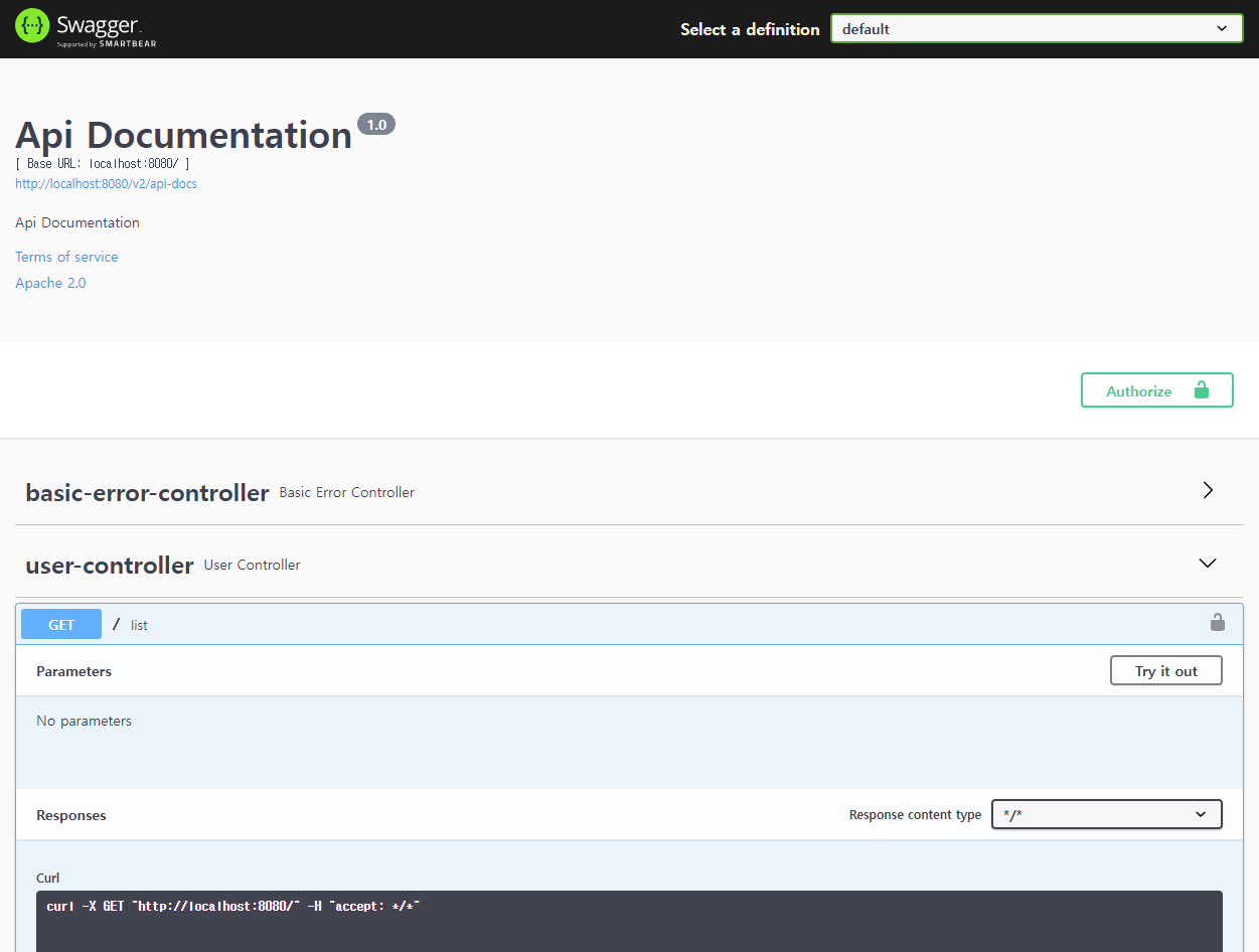 앱 실행 후 http://localhost:8080/swagger-ui/ 로 접속하면 아래와 같은 화면을 볼 수 있습니다.