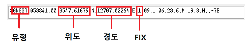 첫 번째, 유형은 간단하게 접두가 GP 와 GN 이 있는데 GP는 일반적인 GPS 값이라고 보면 되고, GN 이면 GNSS 보정을 받을 수 있는 데이터라고 생각하면 됩니다.