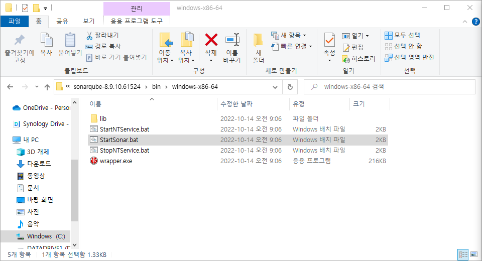사진과 같이 bin\windows-x86-64 경로로 이동하여, StartSonar.bat 파일을 실행시킵니다.